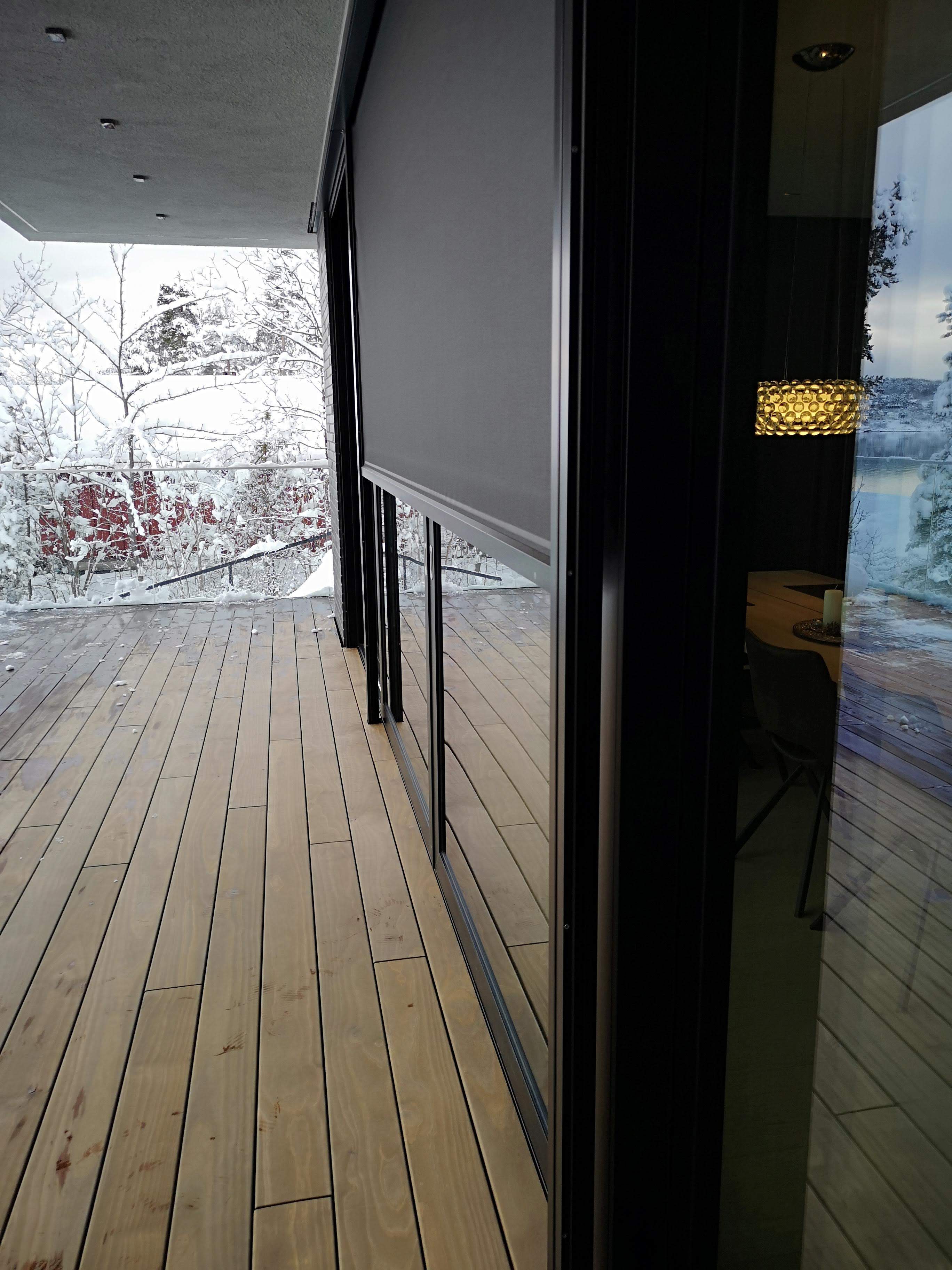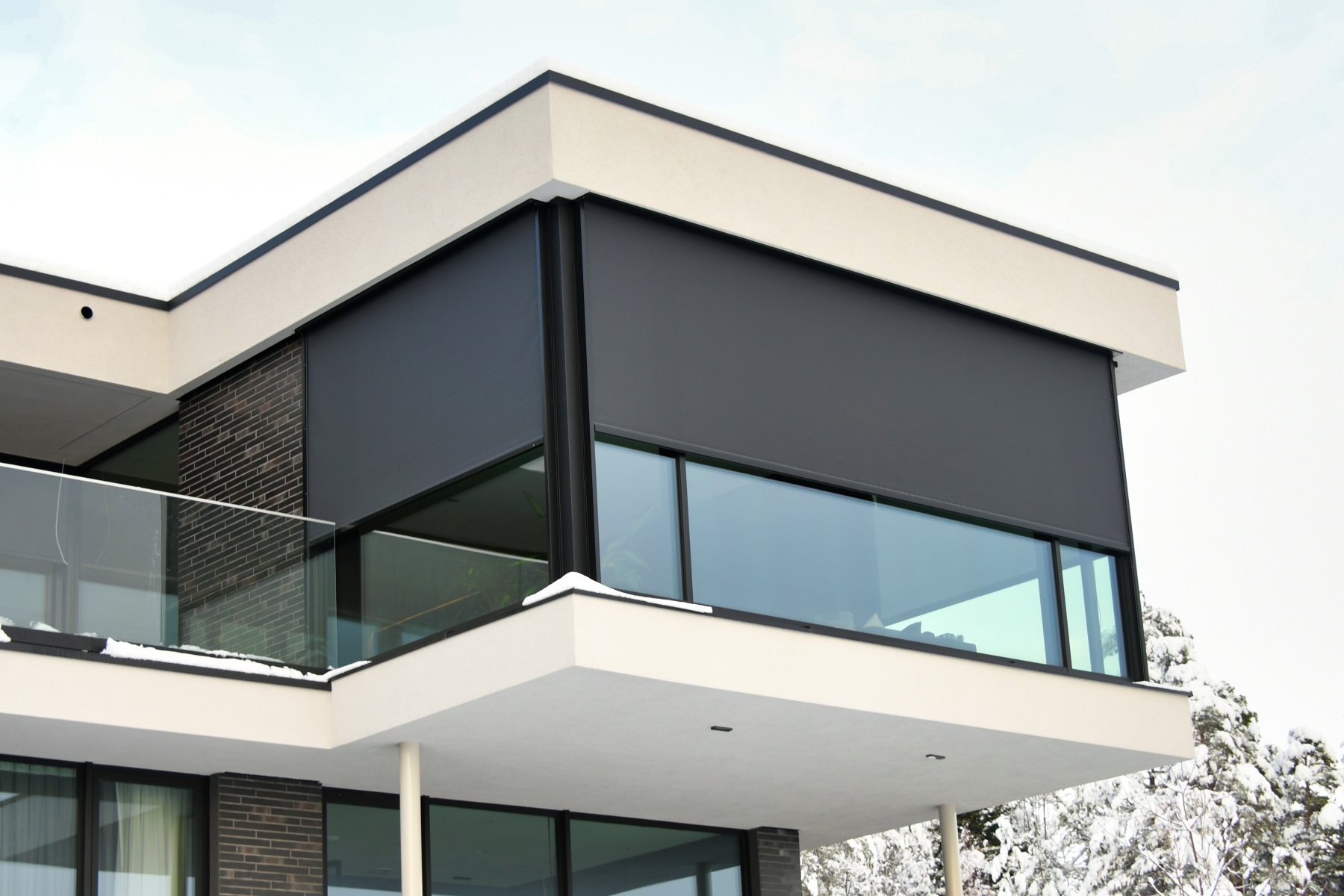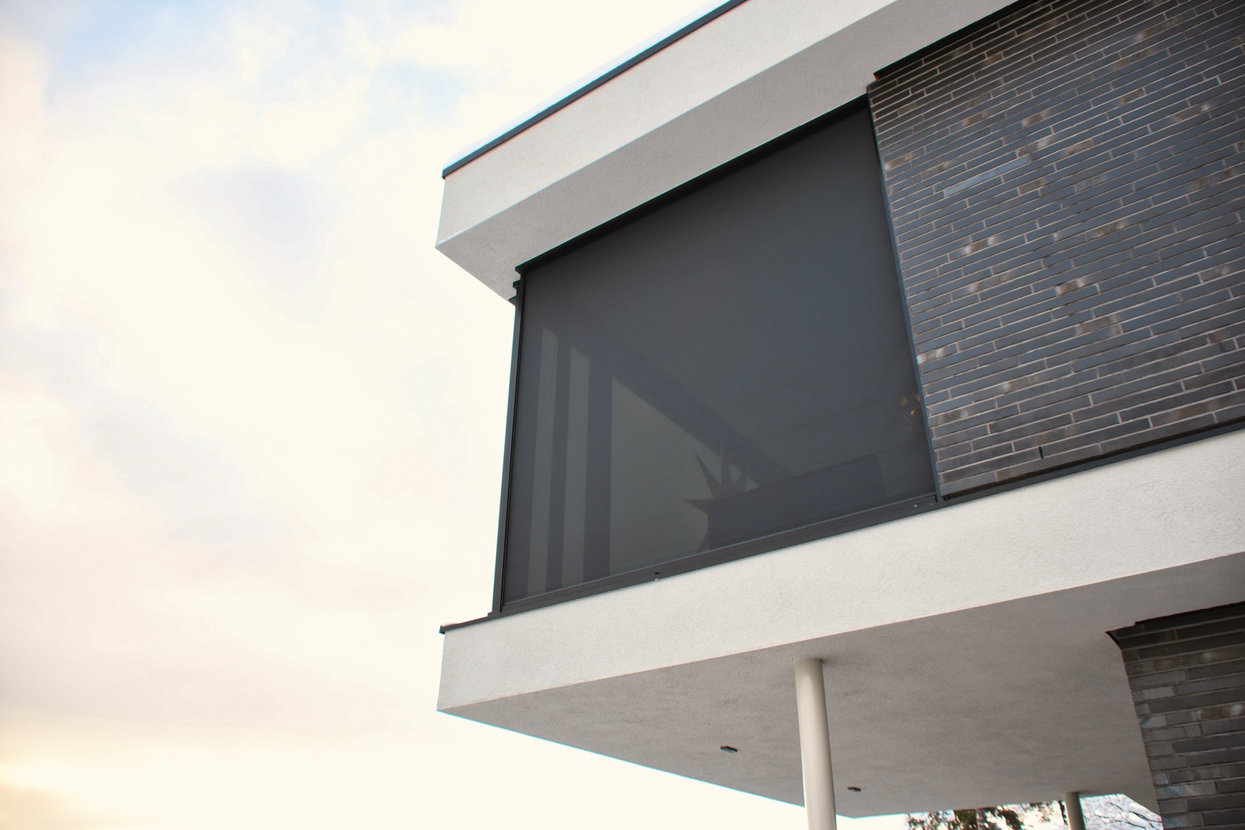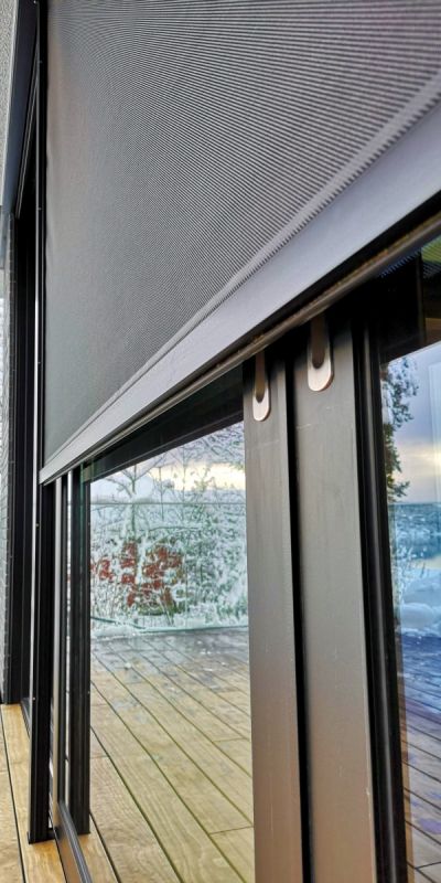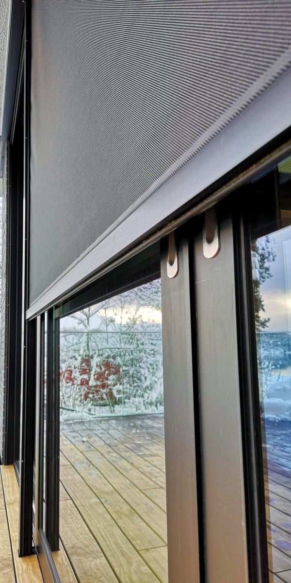 Renson Fixscreen IM7 i RAL9005 med Somfy IO motorer og Serge 600 Charcoal | Charcoal screenduk